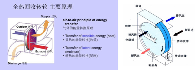 輪式全熱交換器是一種回收由于換氣時所損失能量的節能裝置,由輪芯、密封、殼體、動力機構等組成,以蜂窩輪芯為傳替介質,從高溫氣體中吸收能量在低溫氣體中放出,實現氣與氣之間的能量轉換,轉輪式全熱交換器的核心部件是一個以10-12轉/分鐘的速度不斷轉動的蜂窩狀轉輪。轉芯用特種鋁箔作載體,將無毒、無味、環保型蓄熱、吸濕材料,用高科技方法合成,制作成具有蓄熱吸濕等性能的蜂窩狀轉輪,裝配在一個左右或上下分隔區的金屬箱體內由傳動裝置通過皮帶驅動轉子轉動。夏季運行時,室內排風通過熱回收轉輪時,輪芯吸收房間空氣的冷量,溫度降低,含濕量降低,當輪芯轉到進風側與室外新鮮空氣接觸時,轉輪向高溫的新鮮空氣放出冷量及吸收了水分,使新鮮空氣降溫降濕。冬季與之相反,升高新風溫濕度。通過回收排風中的冷熱量使空調系統的制冷量制熱量降低,達到了節能的目的。由于新風的狀態點不在人體的舒適度,所以要加熱或制冷、除濕或加濕。如排風中的能量能回收再利用將極大改善新風的能耗。全熱交換器就是利用排出空氣與進入的新鮮空氣進行顯熱與潛熱交換而回收能量。在夏天可以將新風預冷及除濕,在冬季可以將新風預熱加濕,其熱回收效率可達70%~90%,因此在保證室內足夠的新鮮空氣置換的前提下,降低了空調運行中冷負荷和耗電量,真正使空調成為健康、節能、環保的新型空調!