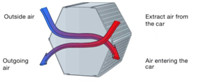 夏季,使用全熱交換器換氣時,將外界將要送入車內的炎熱潮濕的新鮮空氣中的溫度及濕度,通過熱交換芯體傳導至排出室外的室內涼爽干燥而污濁的空氣中去。