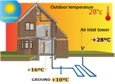 反之,室外溫度為28 oC的夏天,地下土壤的溫度是+12 oC,通過地下管網換熱后通到室內的新風溫度可以達到舒適的+16 oC 。