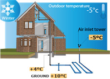 例如:室外溫度為-5 oC的冬天,地下土壤的溫度是+8 oC,通過地下管網換熱后通到室內的新風溫度可以達到+4 oC 。